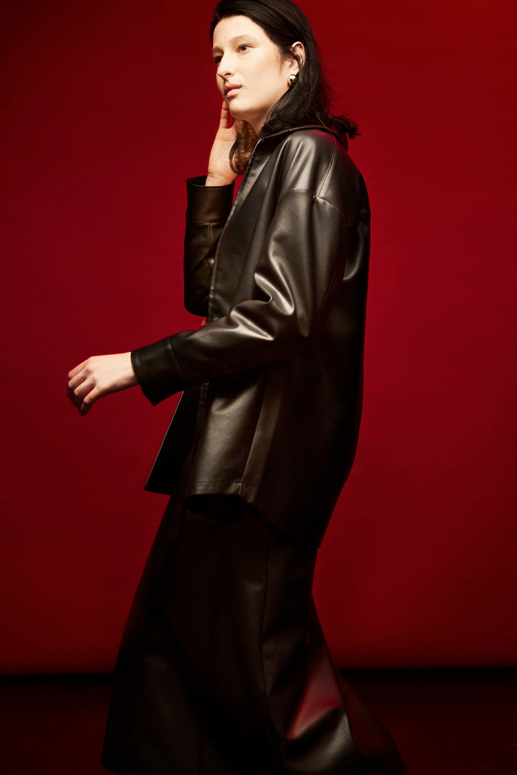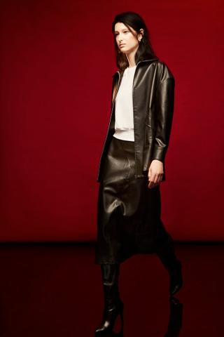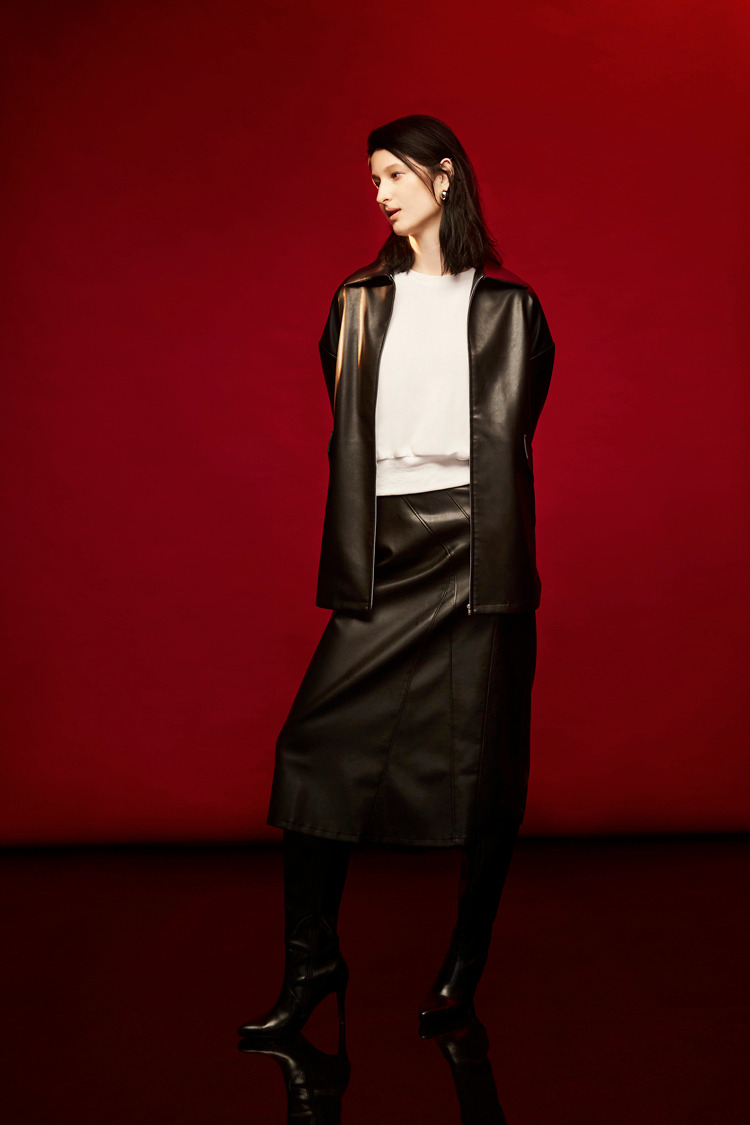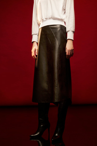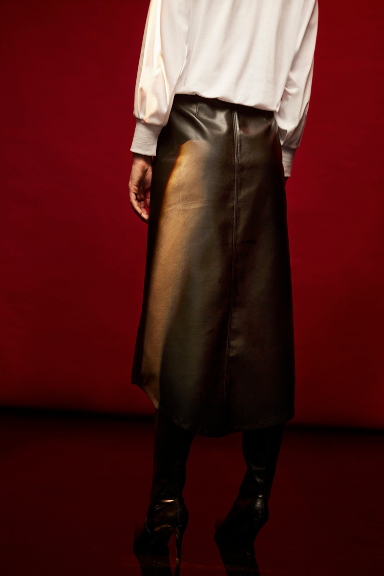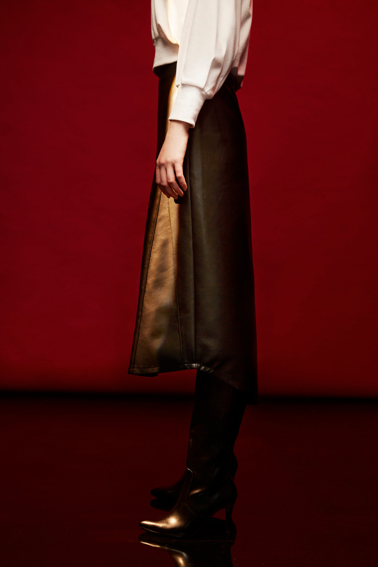 剪接车线不规则下摆皮裙