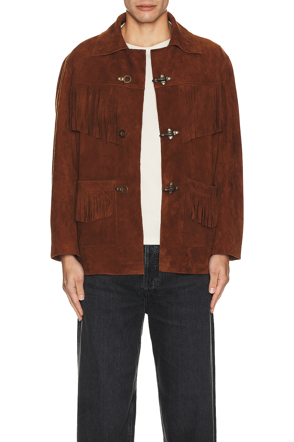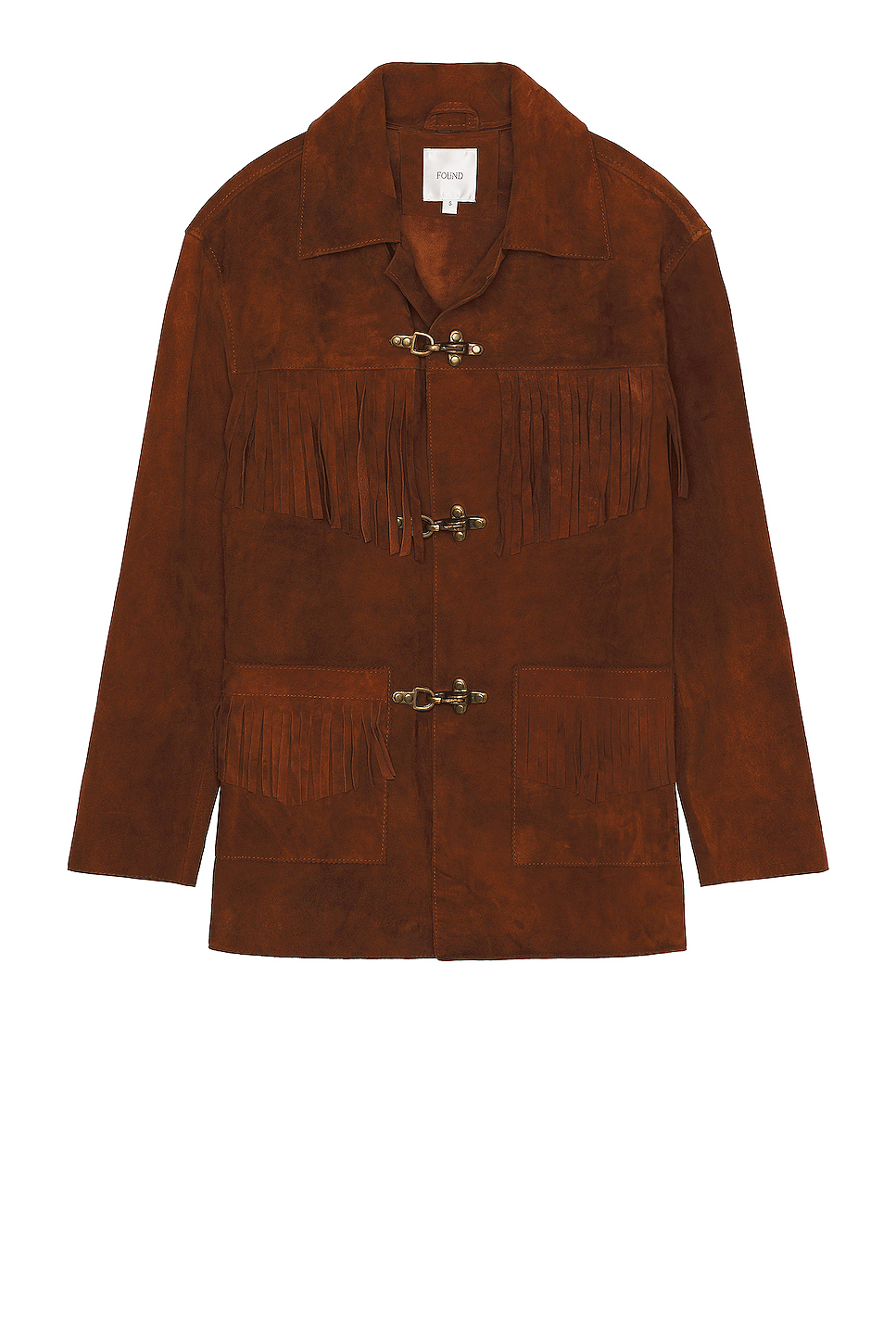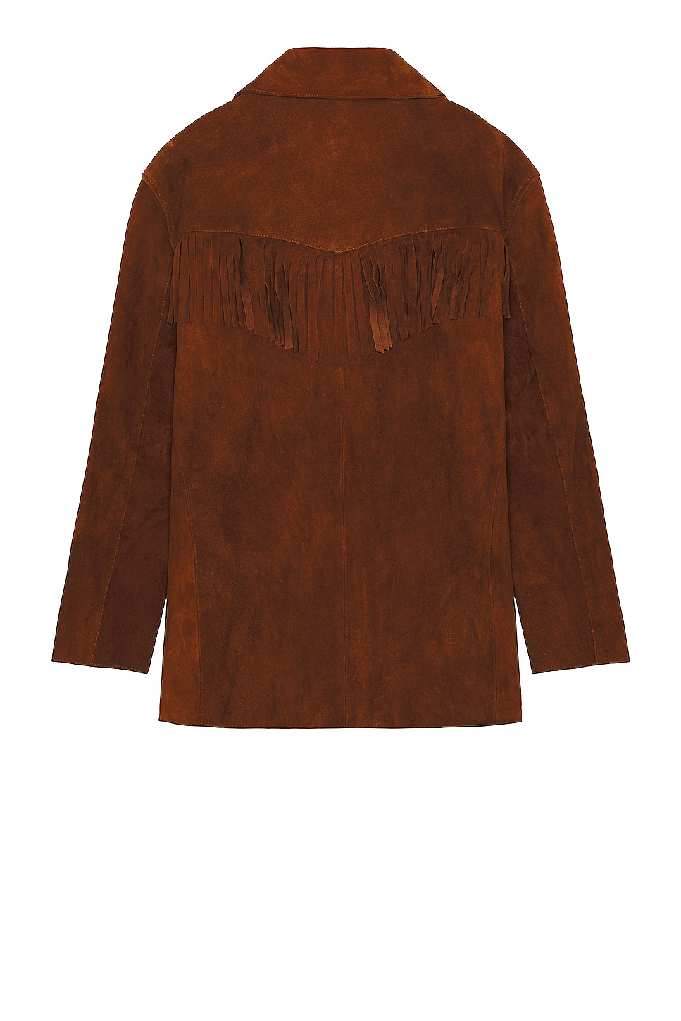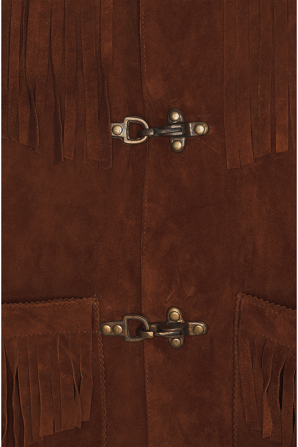 - Midweight suede fabric with fringed trim throughout