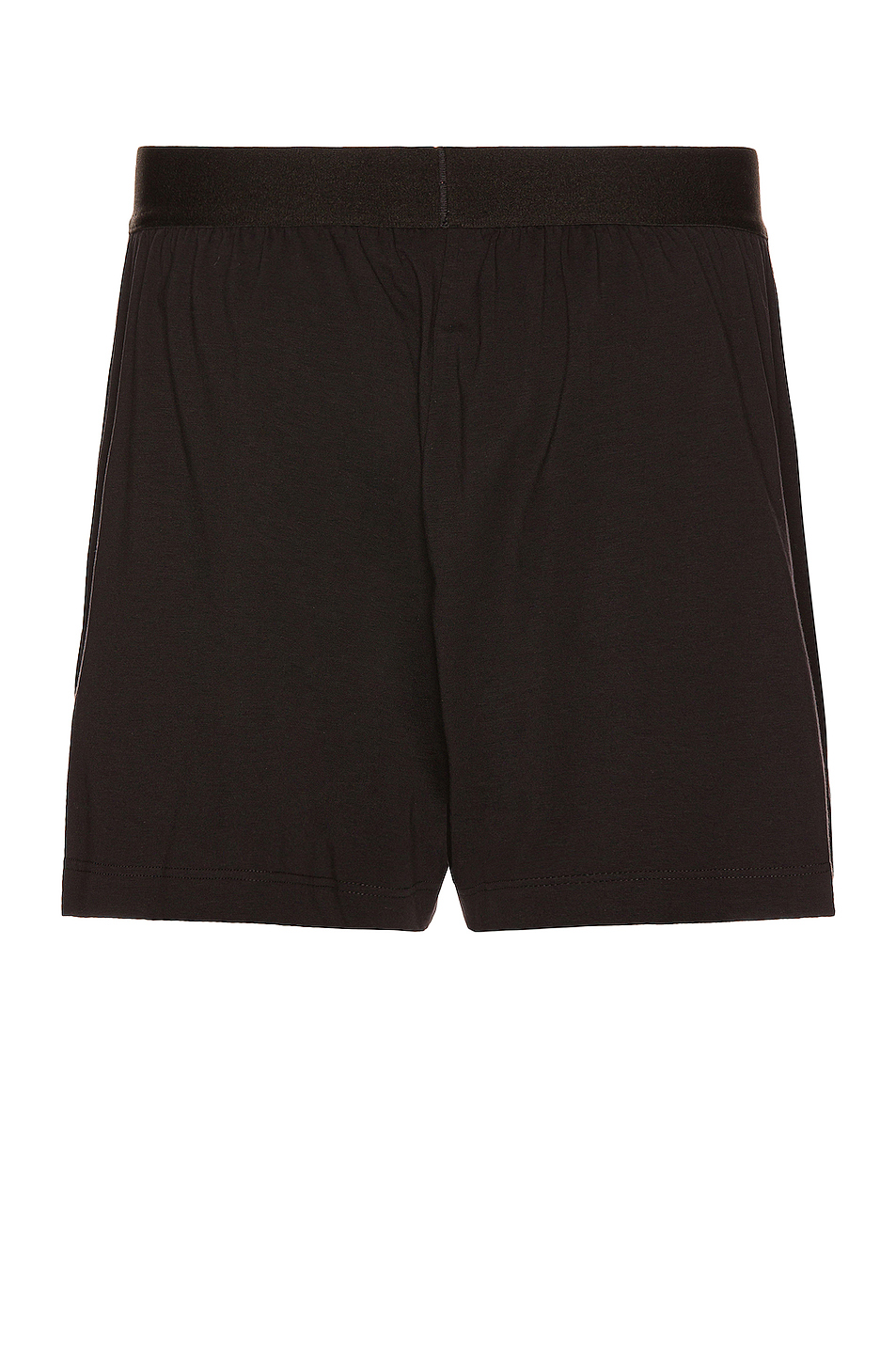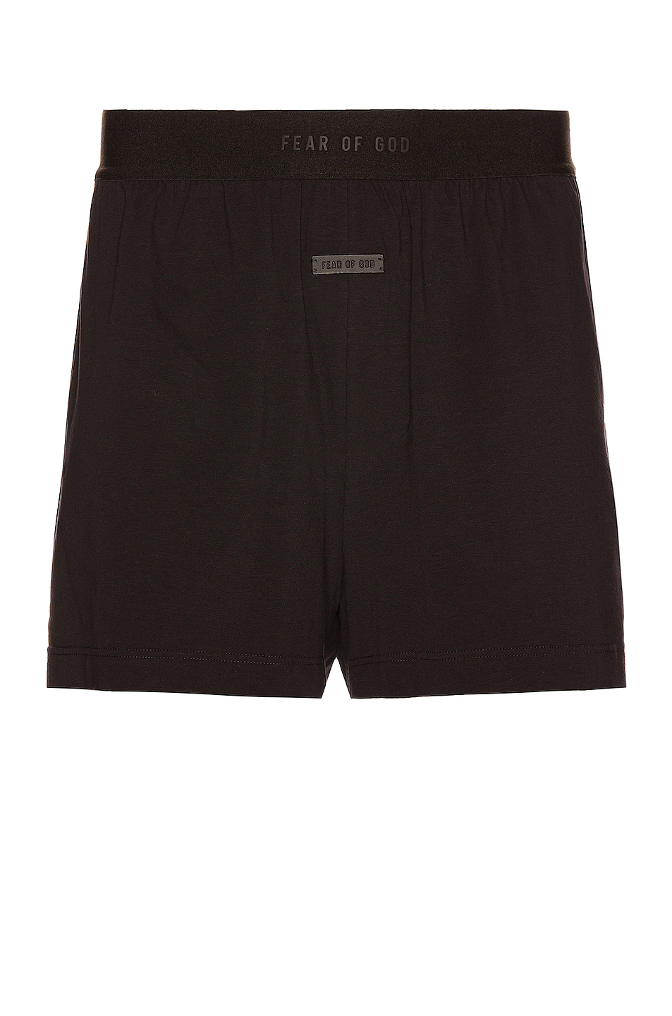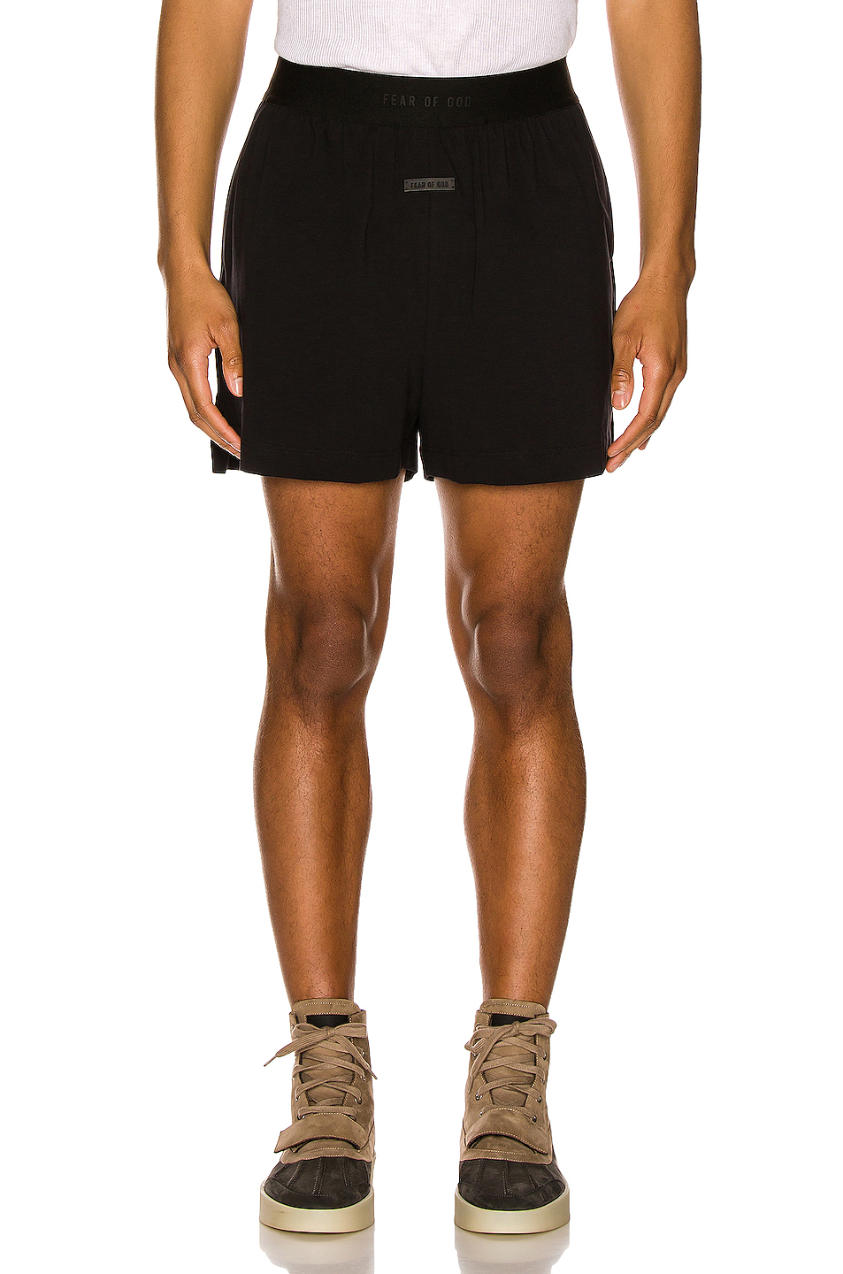- 弹性 logo 裤头,正面 Fear of God 皮革标签