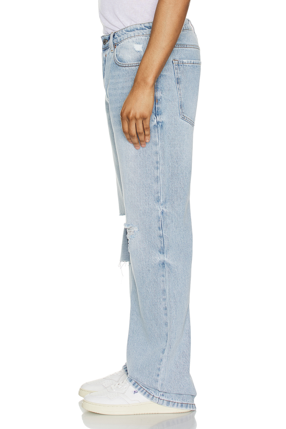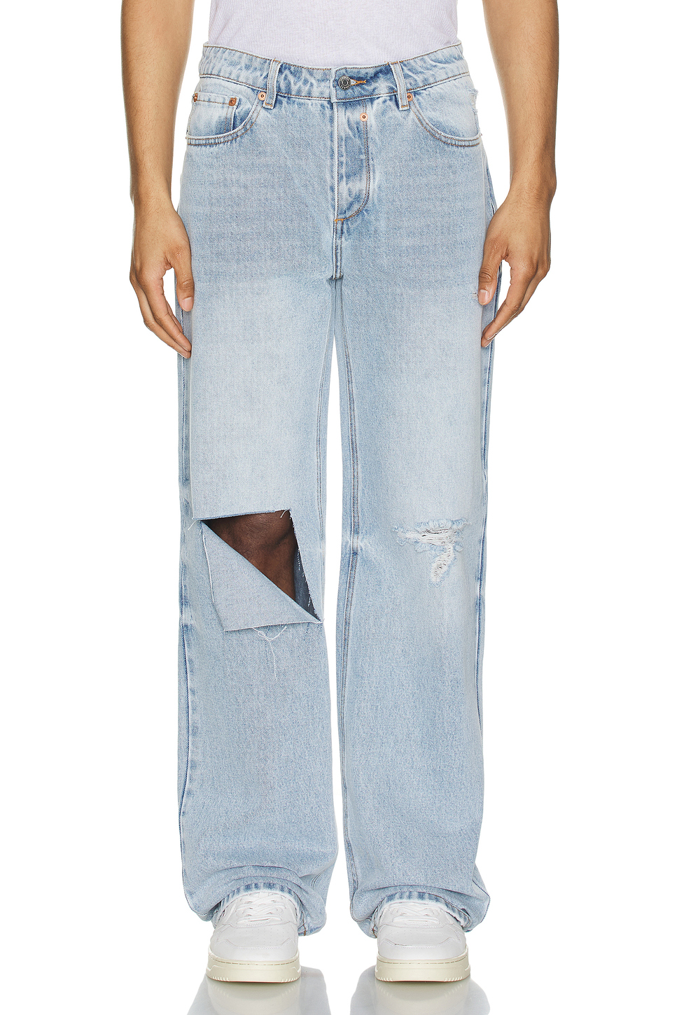 - Rigid denim with distressed detail