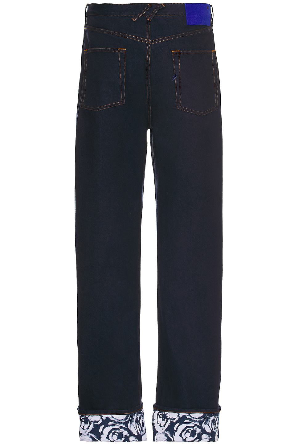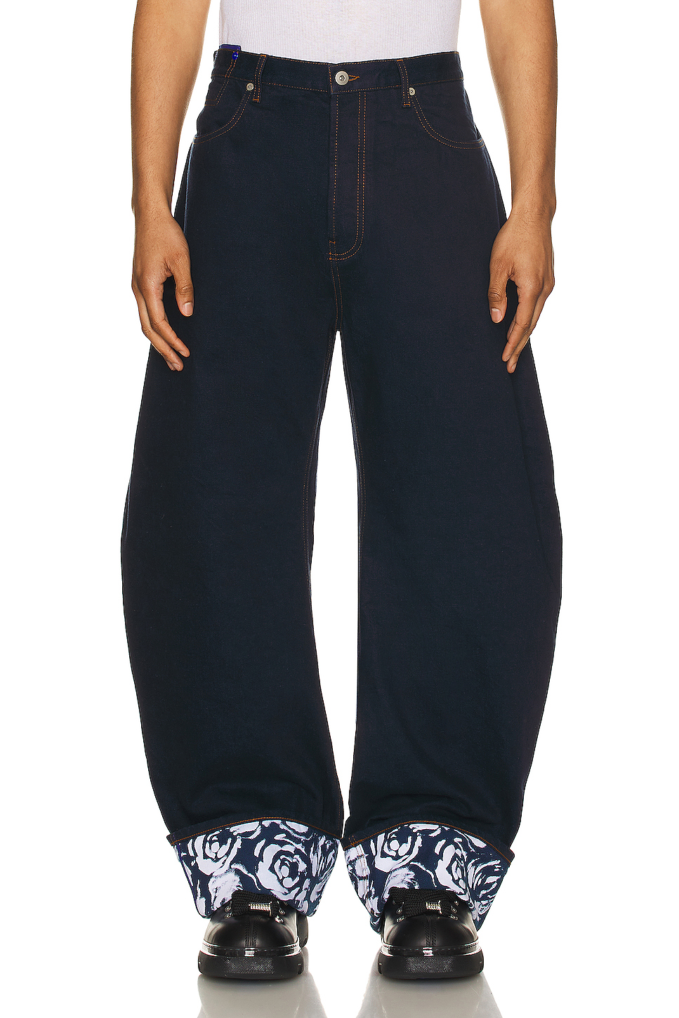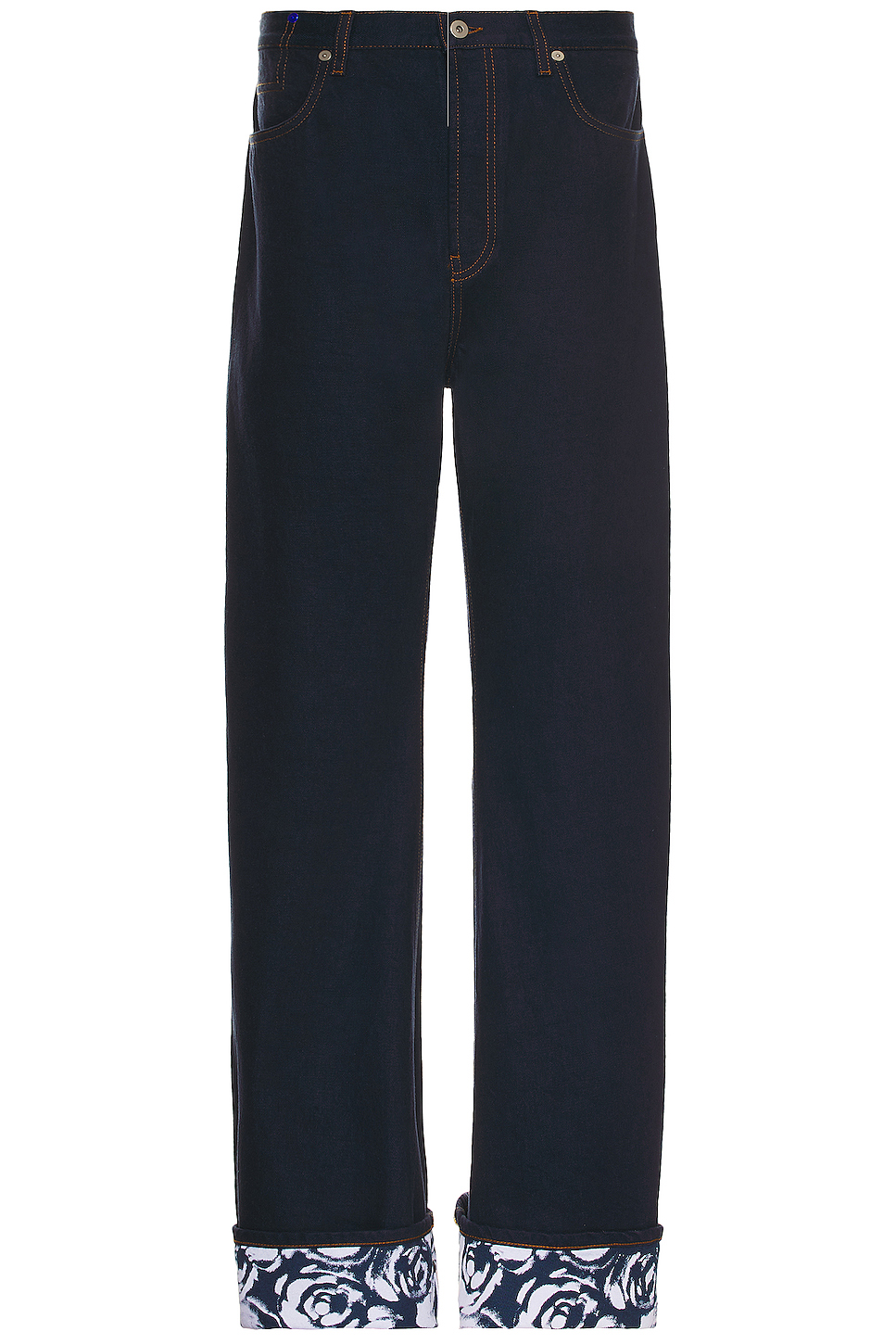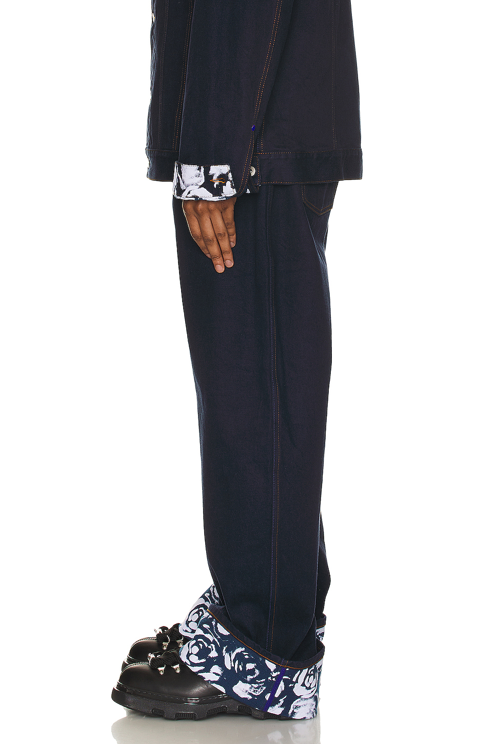 - Structured denim fabric with contrast stitching throughout and novelty cuffs